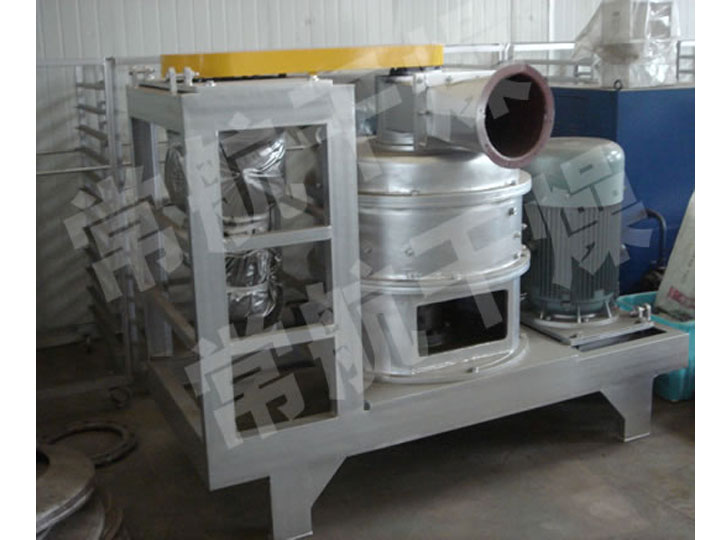 物料經螺旋加料機送入粉碎室內,受到粉碎刀片的高速沖擊和剪切,同時也受到渦流產生的高頻振動而被粉碎,粉碎后的粉體在負壓作用下,越過分流圈而進入分級室,由于分級輪的高速旋轉產生的粉體同時受空氣動力、重力和離心力的作用,當粉體不能越過分級葉輪時,則說明粉體沒有達到一定的細度被甩至分離圈內返回粉碎室繼續粉碎,粉碎合格的粉體受空氣動力的作用送入集料管道后被排出。